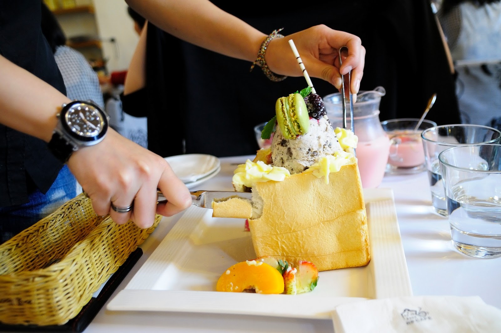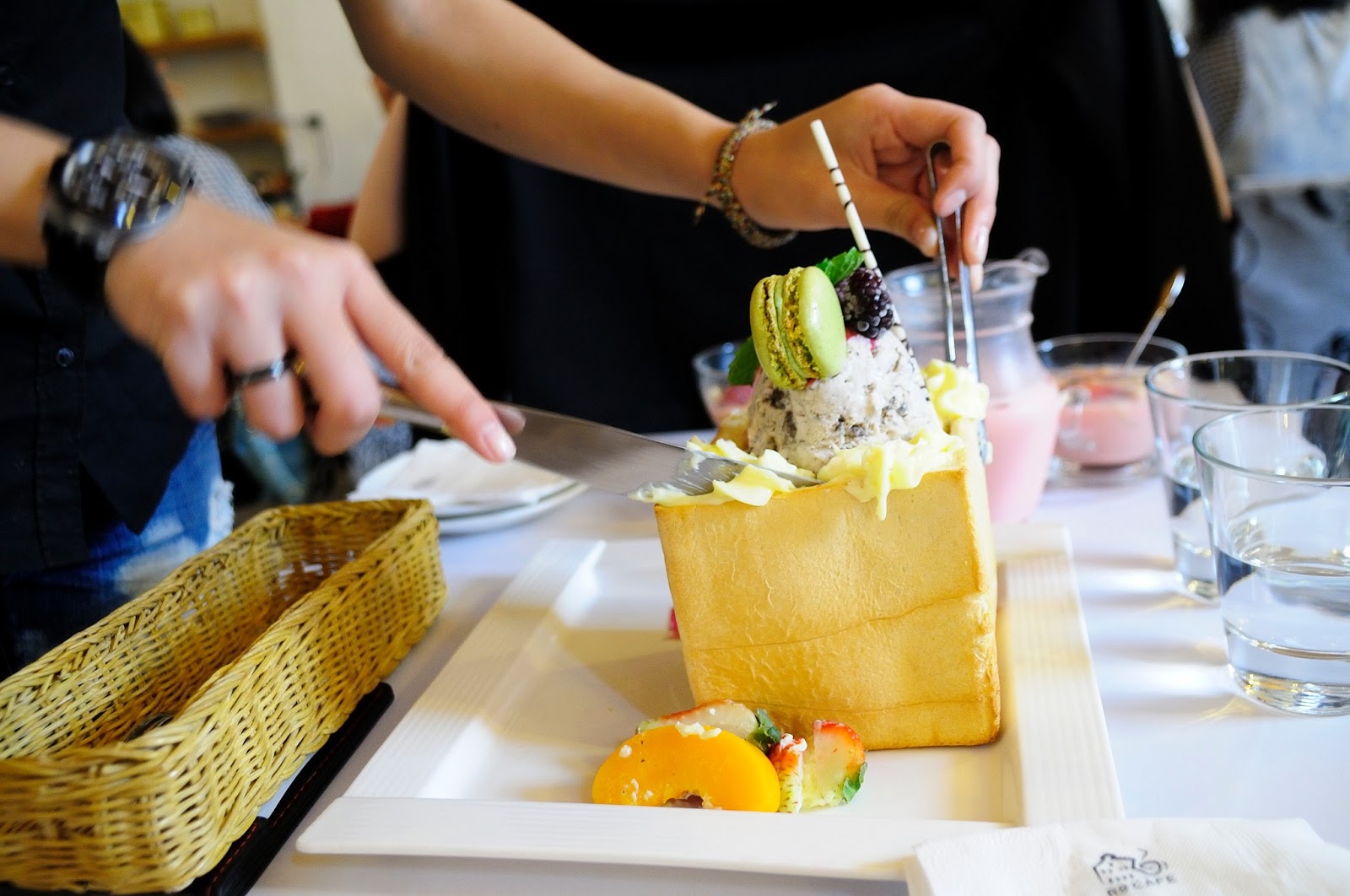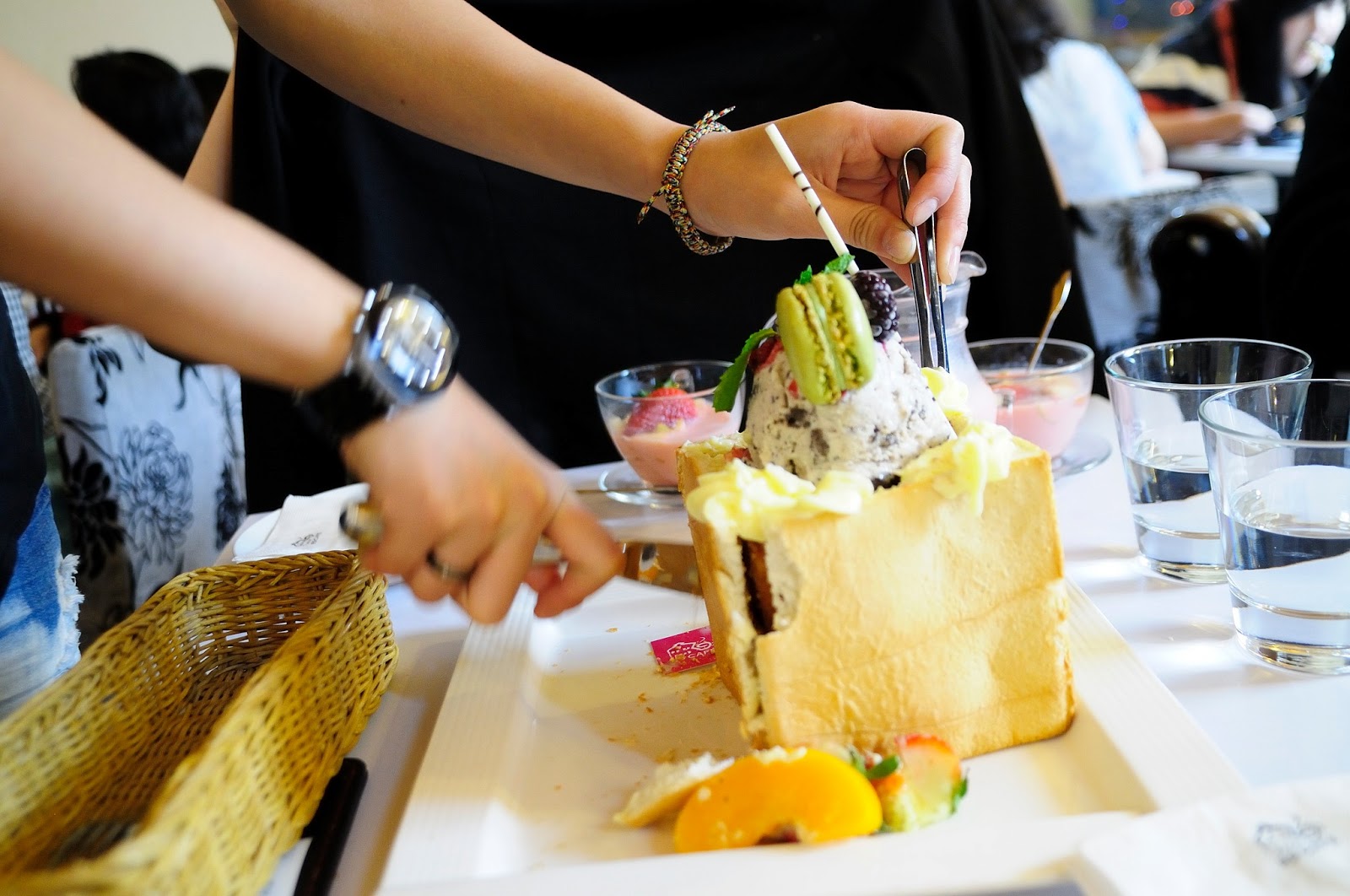 漂亮服務生把一邊的吐司壁切下來 , 把上面花俏的水果與冰淇淋們放下來