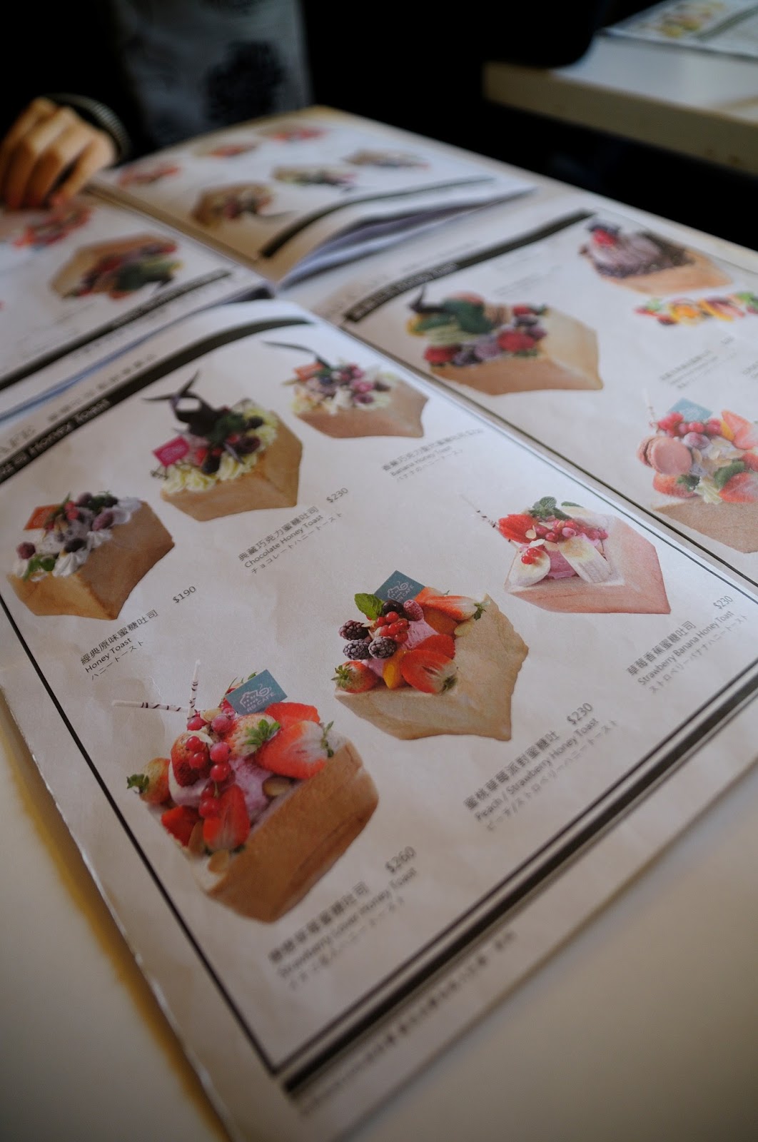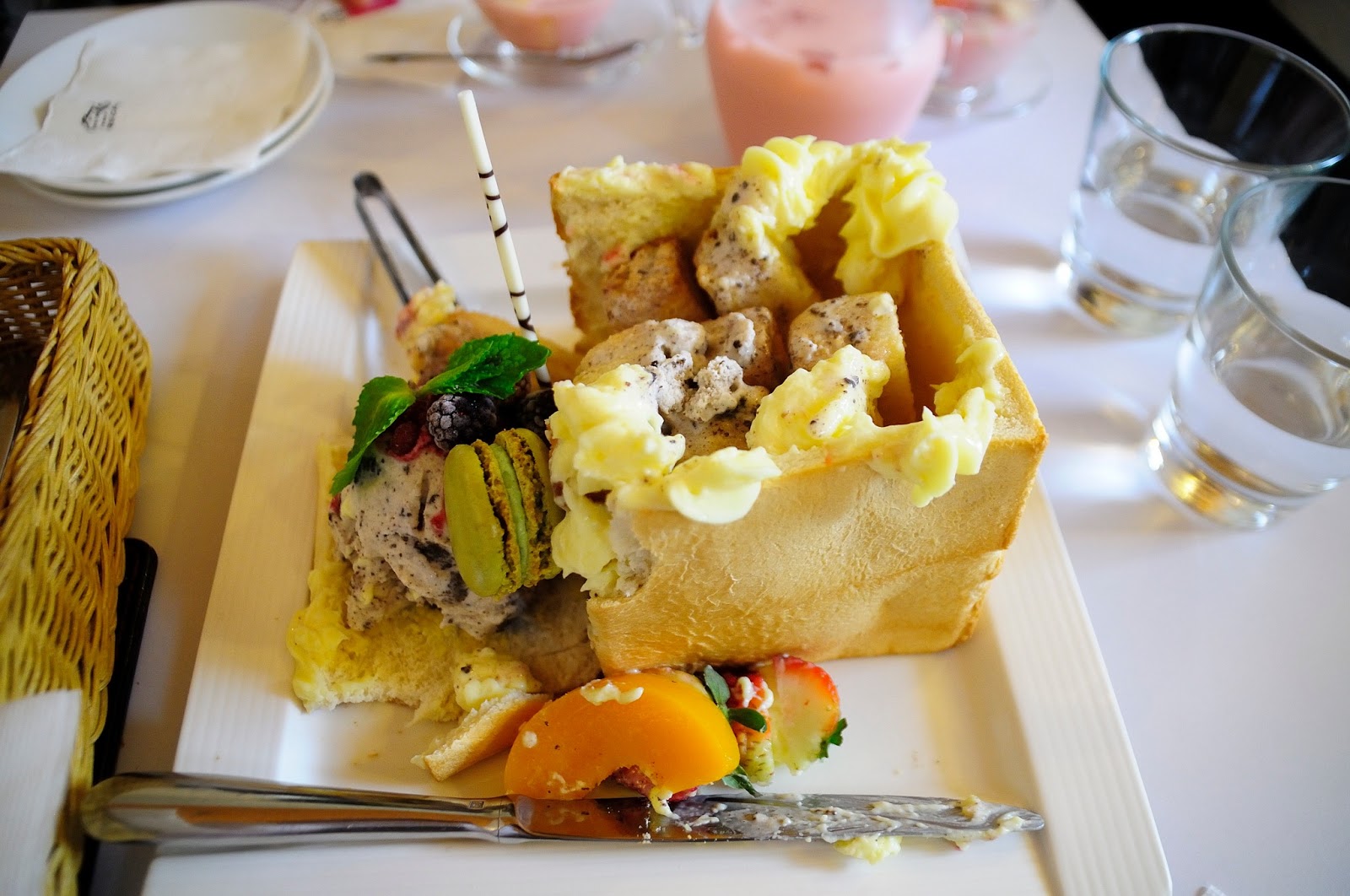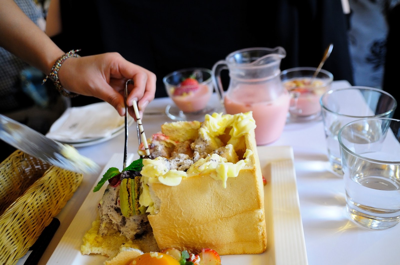 漂亮服務生把一邊的吐司壁切下來 , 把上面花俏的水果與冰淇淋們放下來